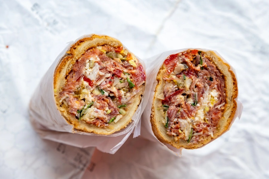 Prosciutto, sopressata, sweet hot cherry peppers, red onion, sharp provolone, fresh mozzarella, tomato, romaine, house-made italian dressing