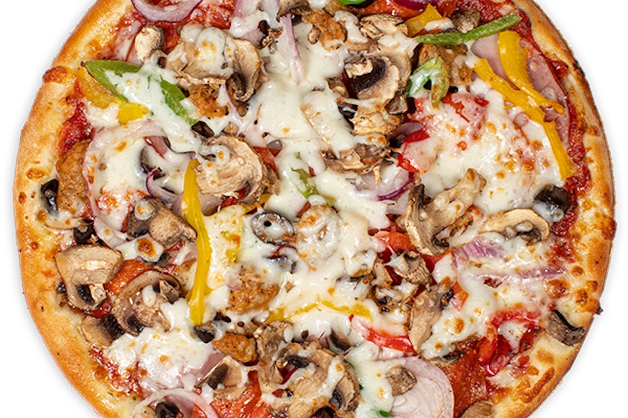 Pinched italian sausage, pepperoni, canadian bacon, mixed bell peppers, red onions, fresh mushrooms, black olives, and mozzarella cheese