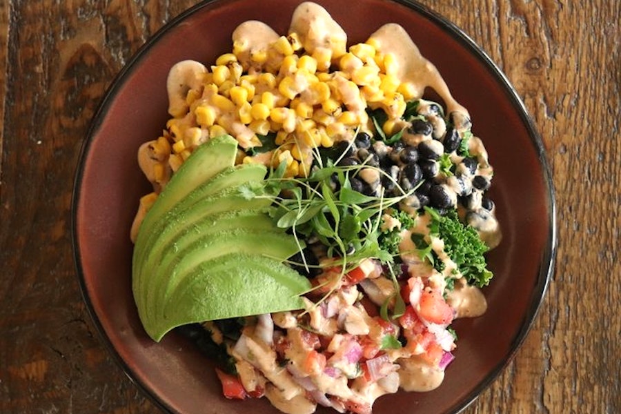 A healthy mix of organic quinoa and brown rice, steamed kale, corn, black beans, fresh salsa, and avocado topped with our spicy chipotle lime dressing