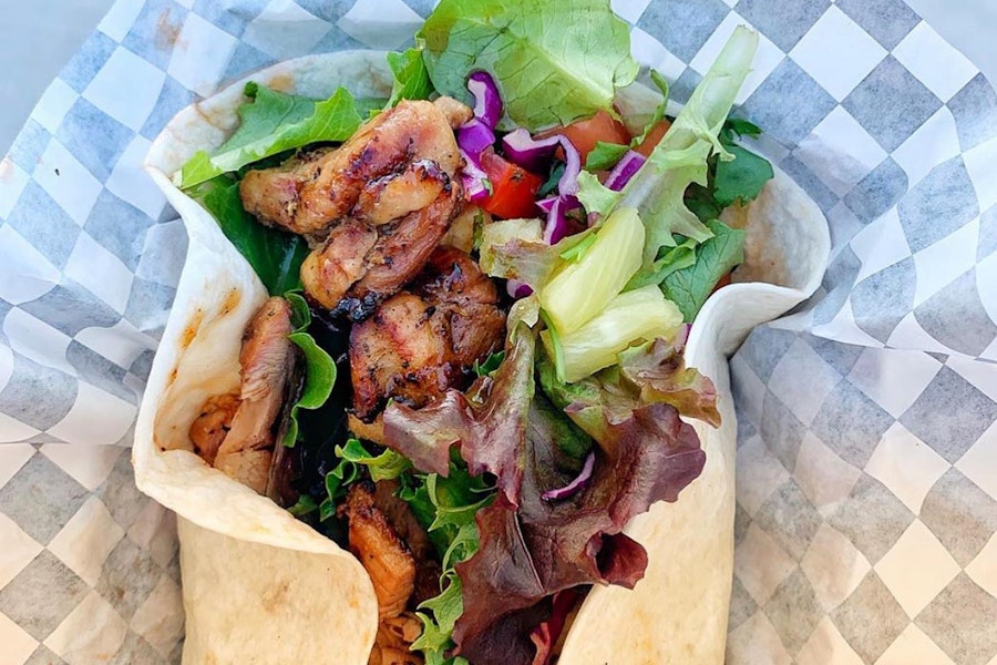 Freshly grilled jerk chicken, spring mix, tomatoes, cucumber, pineapple, cilantro, bell peppers, and purple cabbage wrapped in a tortilla