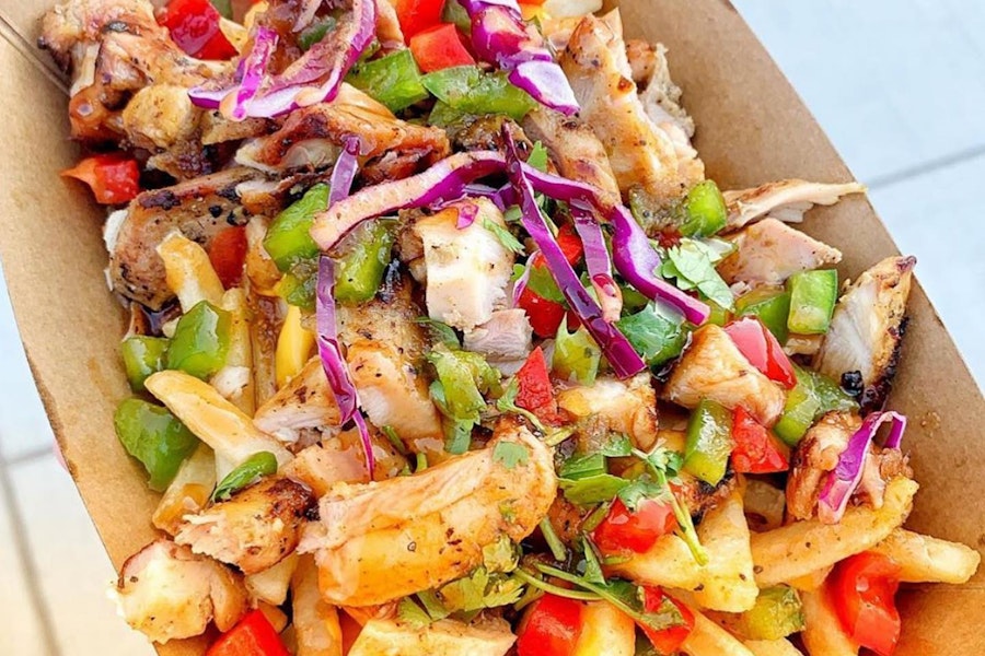 Fries topped with mixed peppers, our flame-grilled jerk chicken and our signature homemade jerk sauce