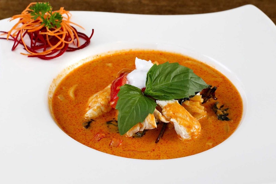 A popular curry that’s sweet and relatively mild with snow peas, diced carrot and red bell pepper (contains shrimp paste)