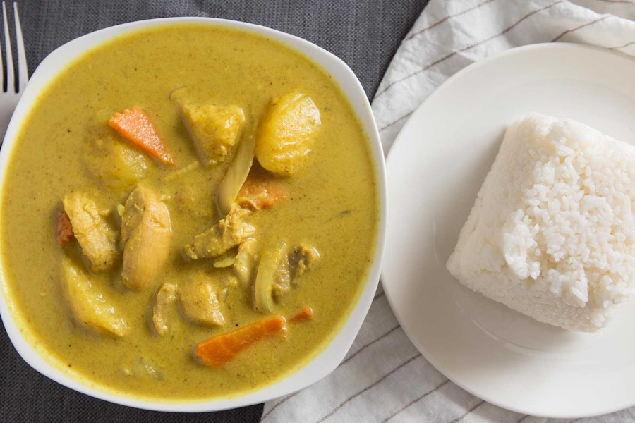 Mild curry with coconut milk and slow-cooked chicken, onion, carrots and potatoes served with jasmine rice