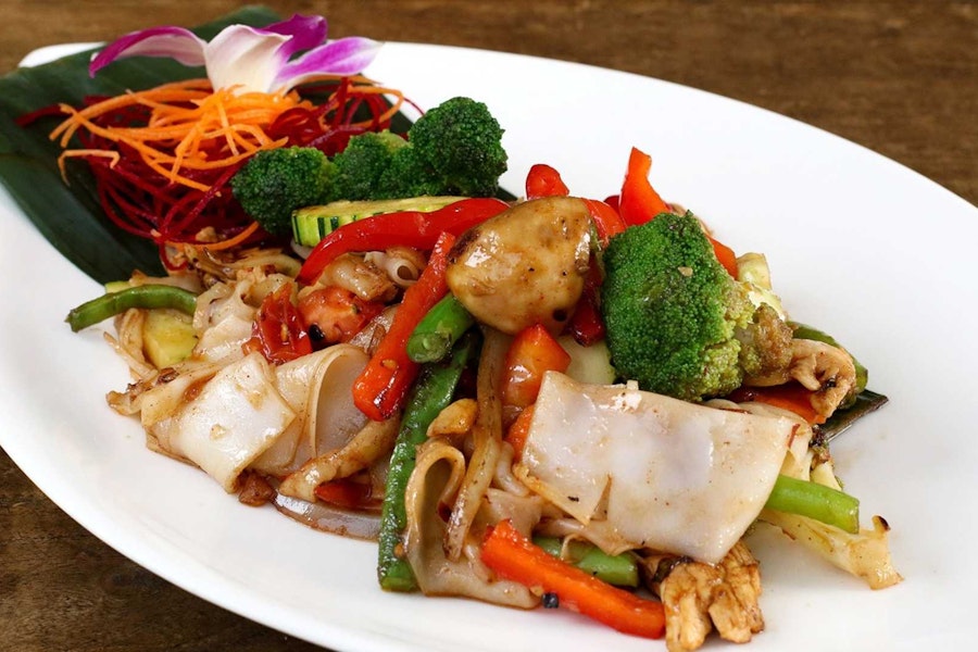 Pan-fried rice noodles served with egg, bean sprouts and crushed peanuts (contains soy and fish sauce)