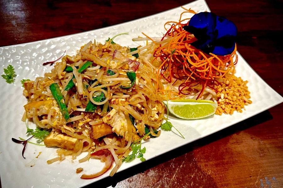 Pan-fried rice noodles served with tofu, bean sprouts, tamari, and crushed peanuts - no fish sauce, soy sauce, or egg