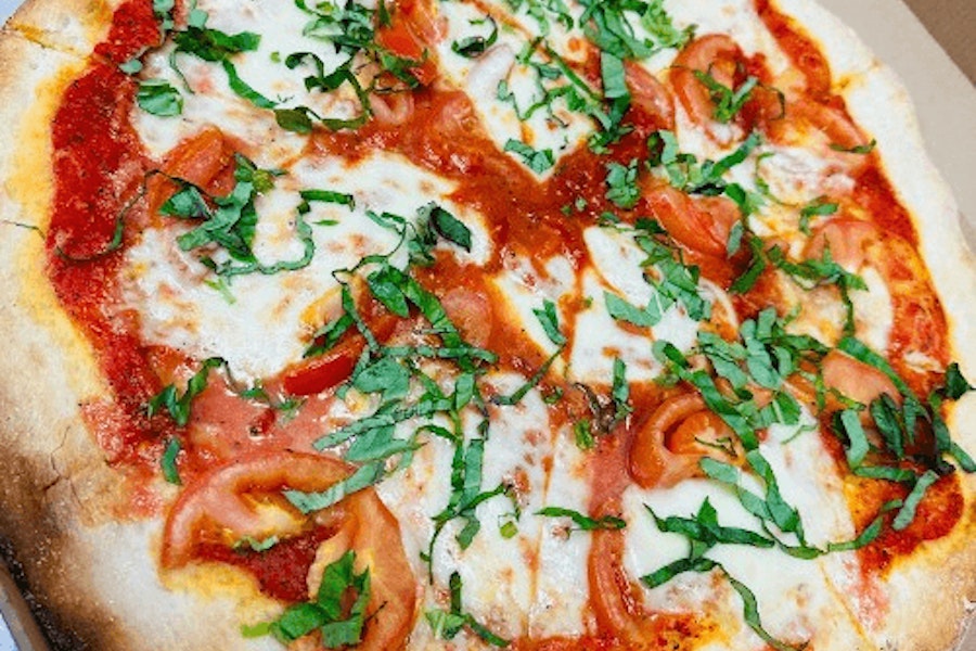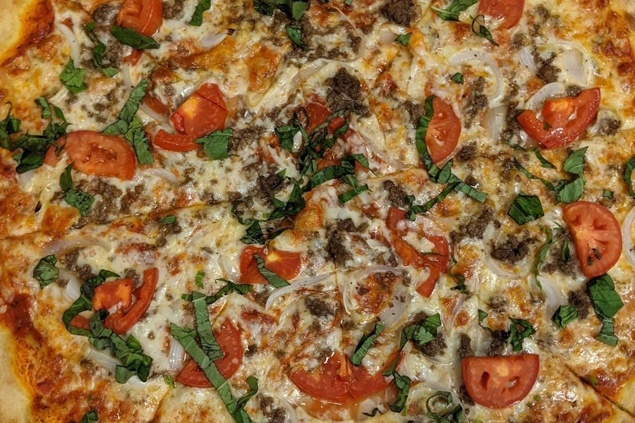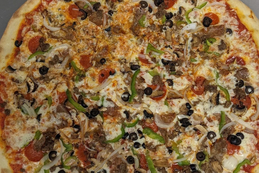 Our ny style crust, zesty house-made marinara, melty dairy-free mozzarella, topped with pepper-no-me, faux sausage, green peppers, onions, and black olives
