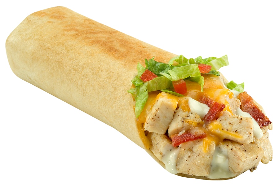 Grilled chicken, bacon, cheddar, lettuce, tomato, and feta on a flour tortilla