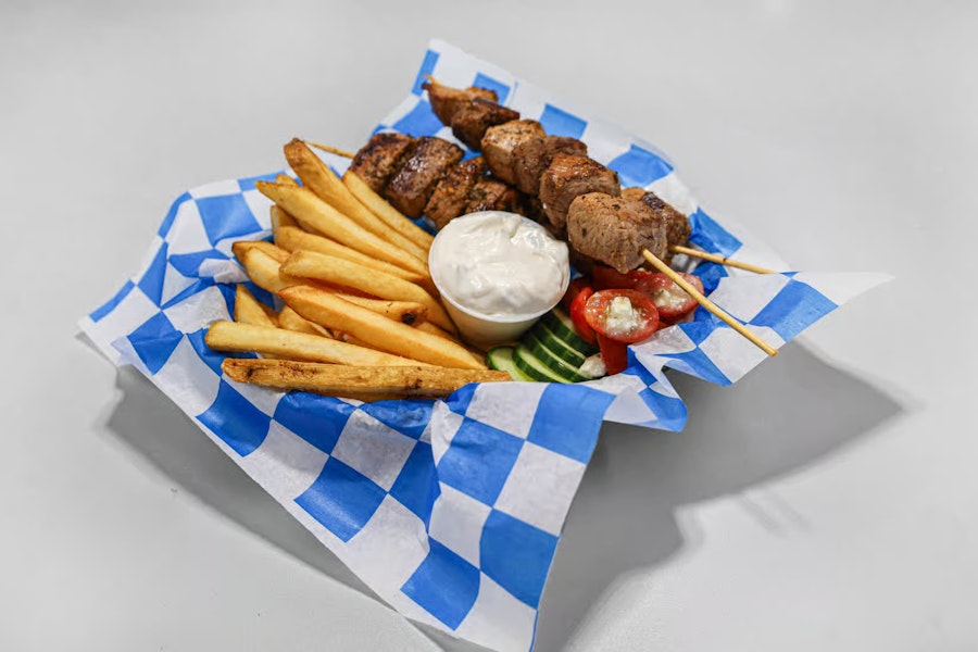 Experience the perfect blend of flavors with our hearty souvlaki plates and refreshing salads, all served with crispy fries and warm pita