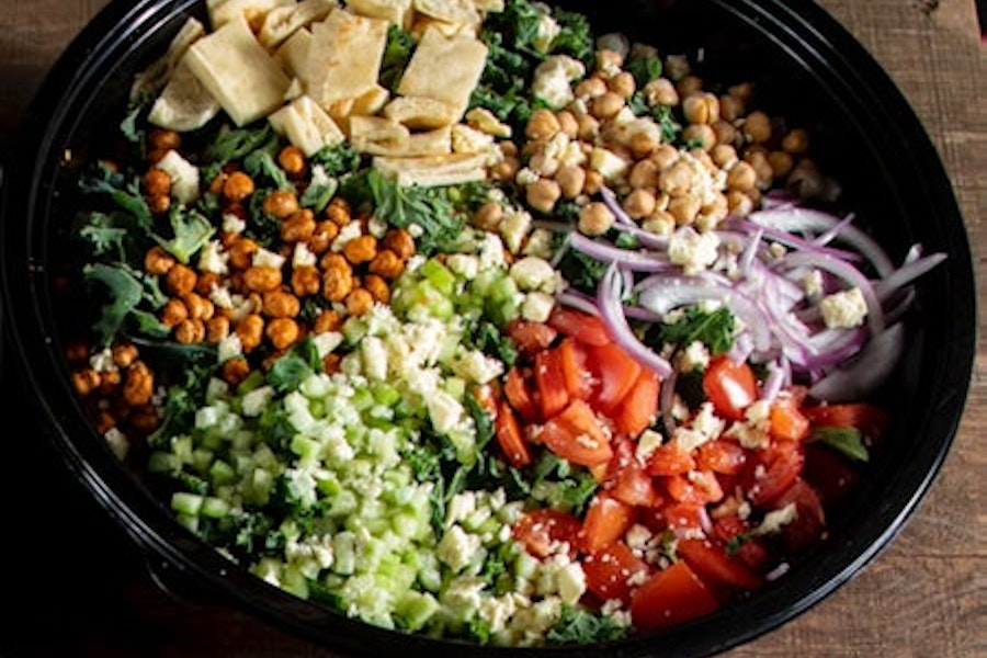 Kale, garbanzo beans, cucumber, tomato, onion, naan cubes, crushed paneer