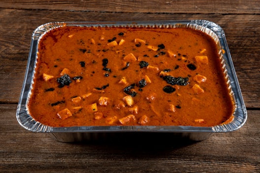 Tandoori spiced paneer (fresh indian cheese) cooked in a sauce made with tomato, onion, garlic, ginger powder, tomato, cumin, coriander, jalapeno, cilantro, dry mango powder, pomegranate powder, cardamom, clove, cinnamon, milk, cream, butter