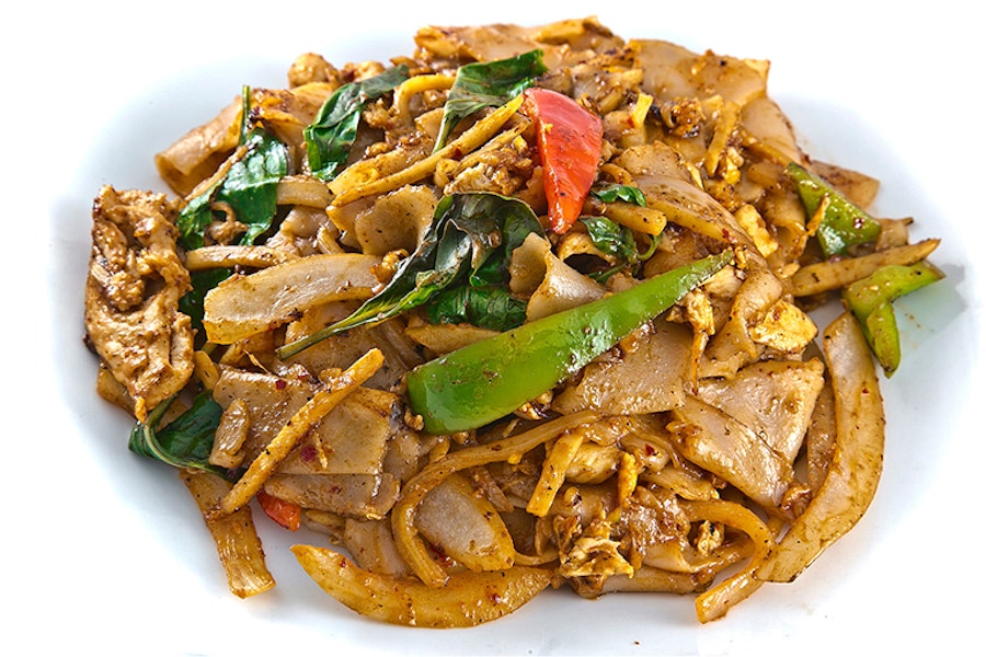 Wide rice noodles stir-fried in a chili paste with egg, bell pepper, broccoli, bamboo shoots, onions, and sweet basil