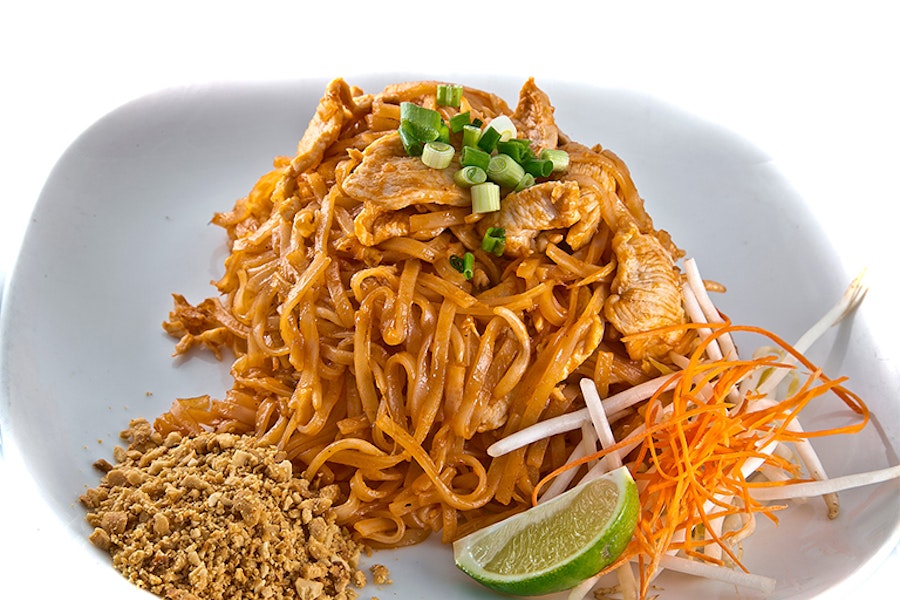 Small rice noodles stir-fried with egg and bean sprouts. Topped with green onions, shredded carrot and ground peanuts
