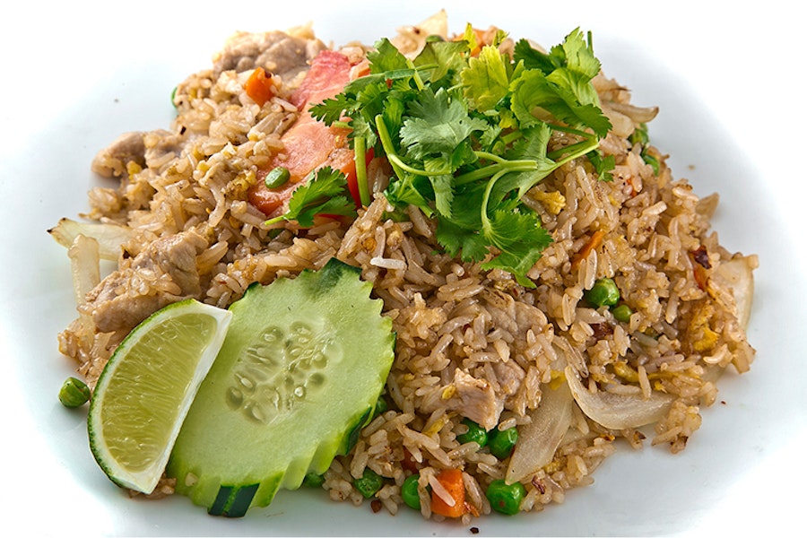 Stir-fried steamed rice, yellow curry powder, onions, tomatoes, carrots, peas, egg and pineapple. Topped with cucumber and cilantro