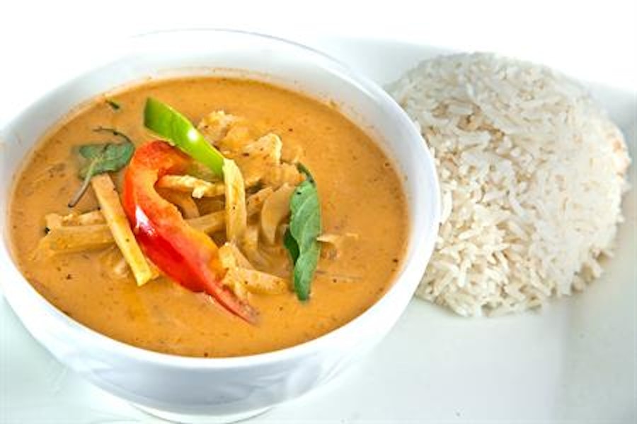 Entrees and curries are served with steamed jasmine rice