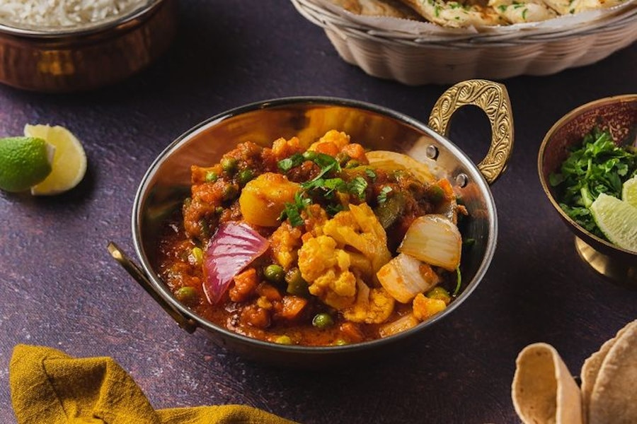 Cauliflower & potatoes cooked with onions, tomatoes, and garam masala gravy