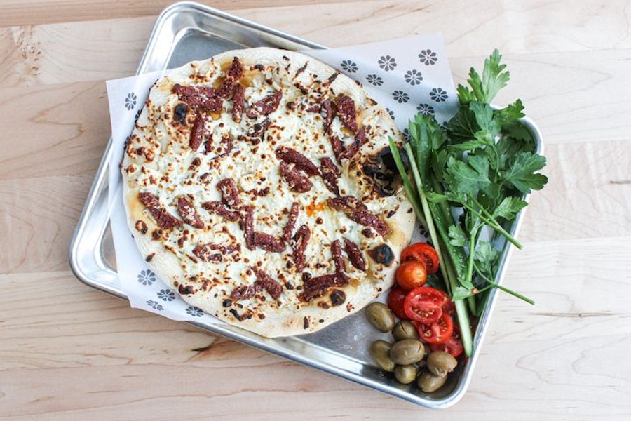Arabic cheese & arabic beef sausage flatbread, herbs