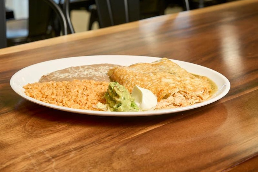 Made with your choice of protein rolled in corn tortillas. Served with rice (contains chicken stock), beans, sour cream and guacamole