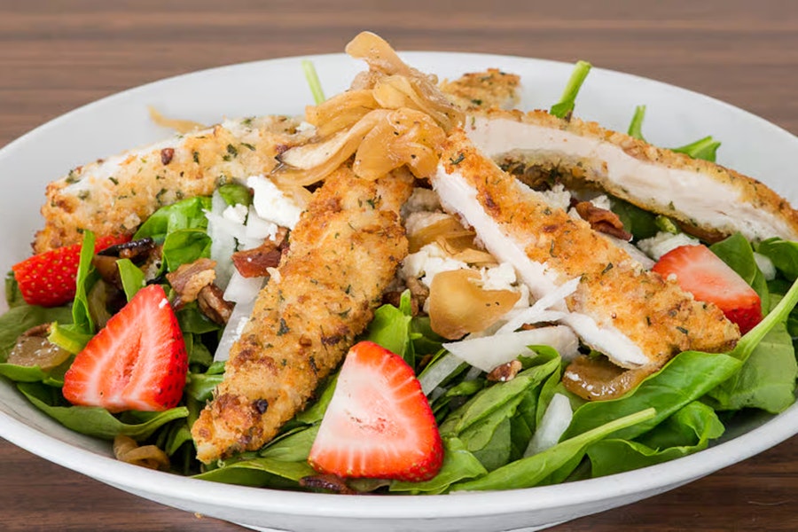 Fresh spinach leaves with caramelized red onions, brazos pecans, strawberries, jicama and goat cheese, warm bacon dressing