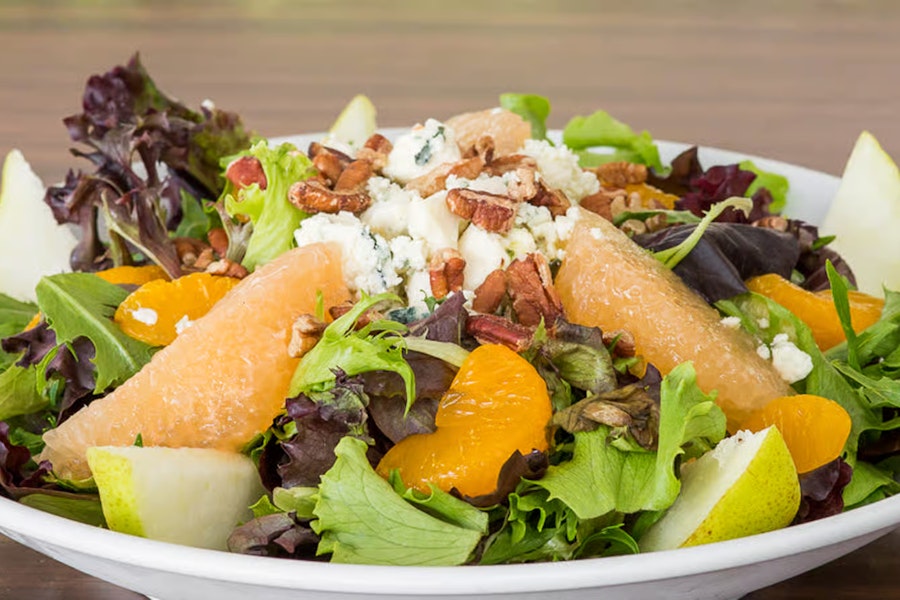 Mixed lettuces with brazos pecans, gorgonzola, mandarin oranges and bosc pears with fresh grapefruit-poppyseed dressing
