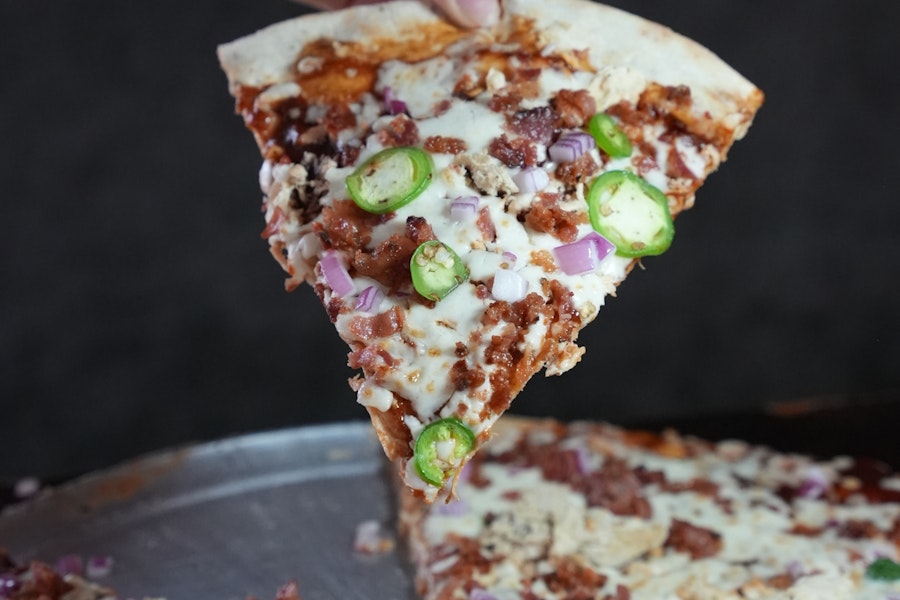 With mozzarella, chicken, jalapeños, red onion, crumbled bacon, and spicy bbq sauce