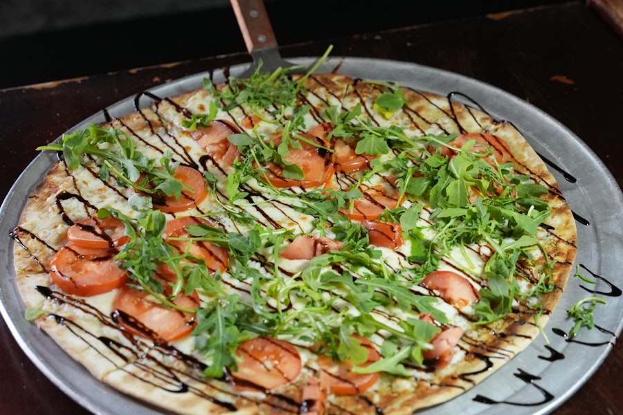 With mozzarella and tomatoes in a garlic, oregano, and olive oil base. Topped with arugula & balsamic glaze