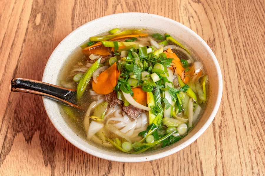 Pan-fried beef with celery, carrots, onions, & leeks rice noodle soup