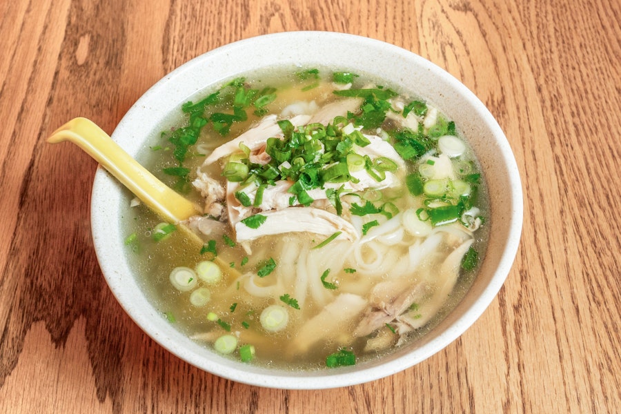 Chicken, finely sliced egg, fancy pork, shrimp paste, vermicelli noodle soup