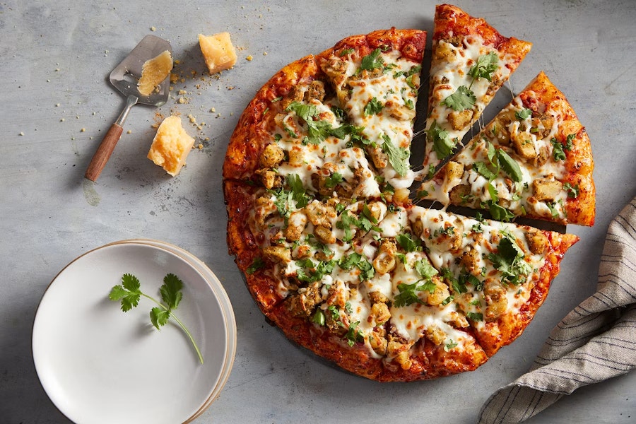With marinated chicken, malai sauce, cheese, diced tomatoes, and red onions