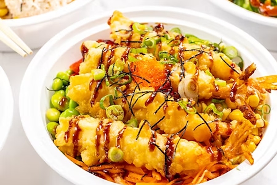 Perfectly golden tempura shrimp and creamy crab salad with a vibrant medley of toppings, including sweet corn, crunchy carrot, tender edamame, savory seaweed salad, soft fish cake, crisp purple cabbage &, tangy oshinko, and earthy wood ear mushrooms. Sprinkle on furikake for a delightful crunch, and finish with a rich drizzle of sweet poké sauce