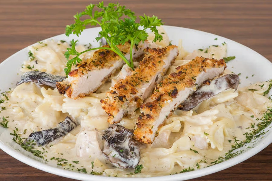 Grilled chicken breast, mushrooms, caramelized onions and peas, alfredo
