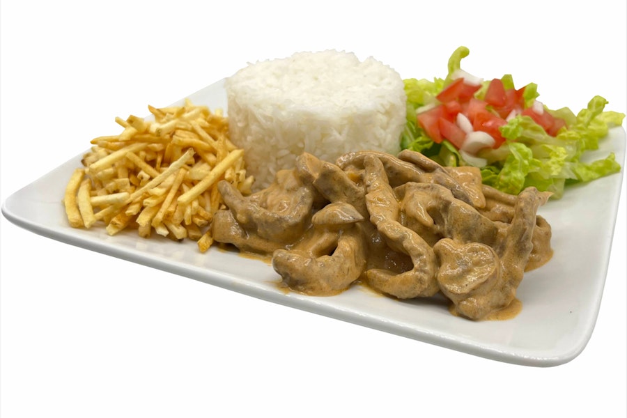 Cuts of flank steak smothered in a bechamel mushroom cream sauce, white rice, and potato sticks