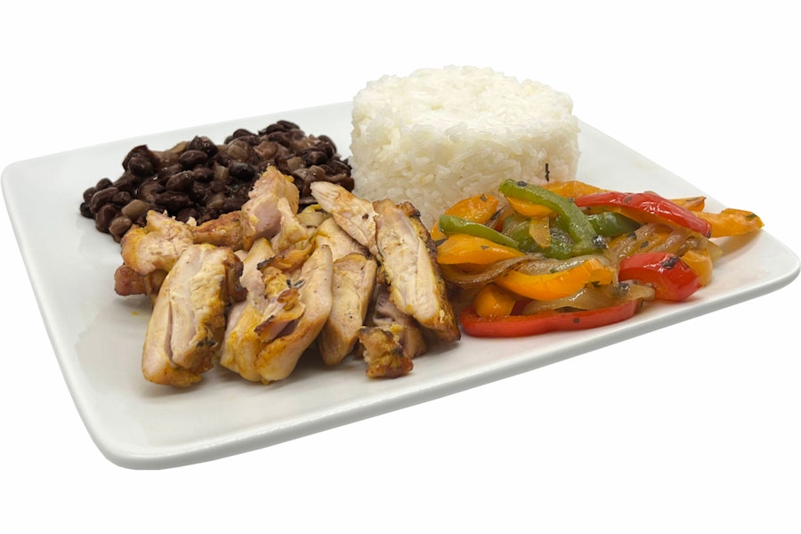 Grilled chicken, white rice, black beans, grilled onions & bell peppers