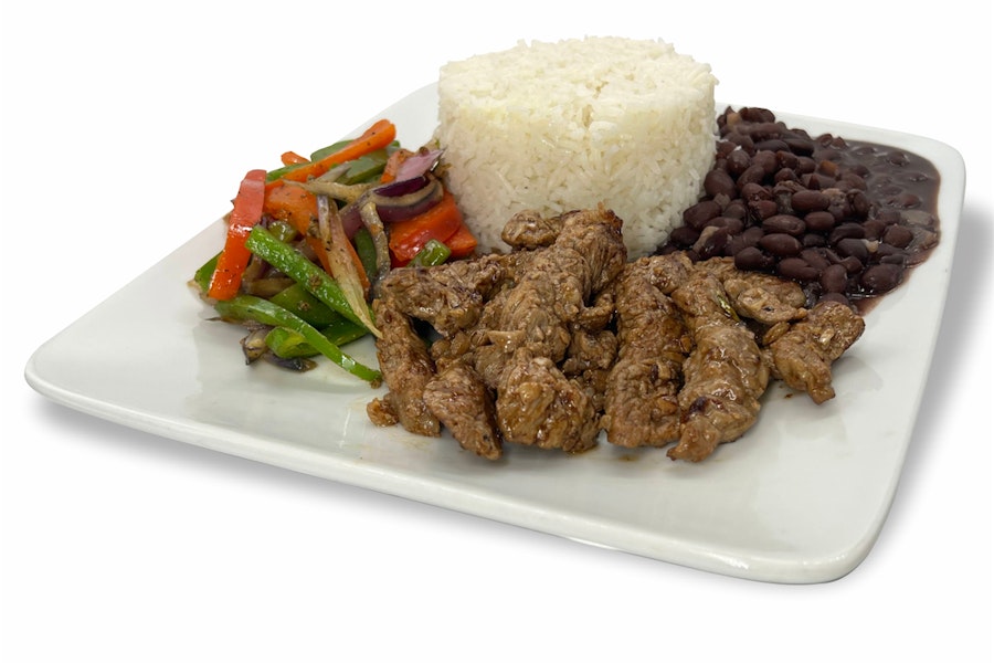 Grilled steak, white rice, black beans, grilled onions & bell peppers