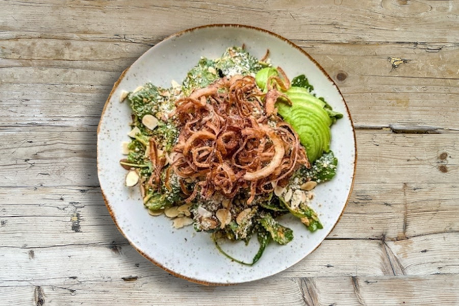 Crispy shallots, toasted almonds, avocado, almond parmesan, breadcrumbs, harissa dressing