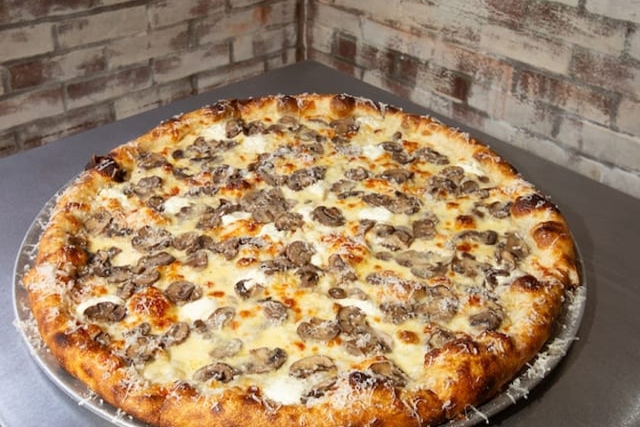 Made with local mozzarella, local provola, house made garlic lemon cream, roasted mushrooms, & finished with aged parmigiano reggiano