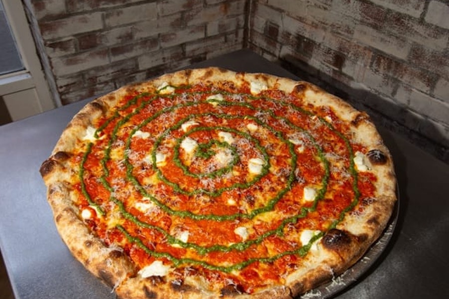 Topped with our in house vodka sauce, pesto sauce, local fior di latte, crispy pepperoni, and aged parmigiano reggiano