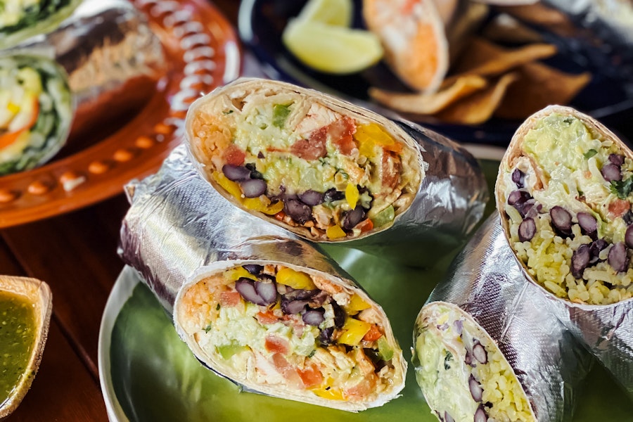 Cilantro rice, black beans, lettuce, salsa fresca and guacamole wrapped in a flour tortilla