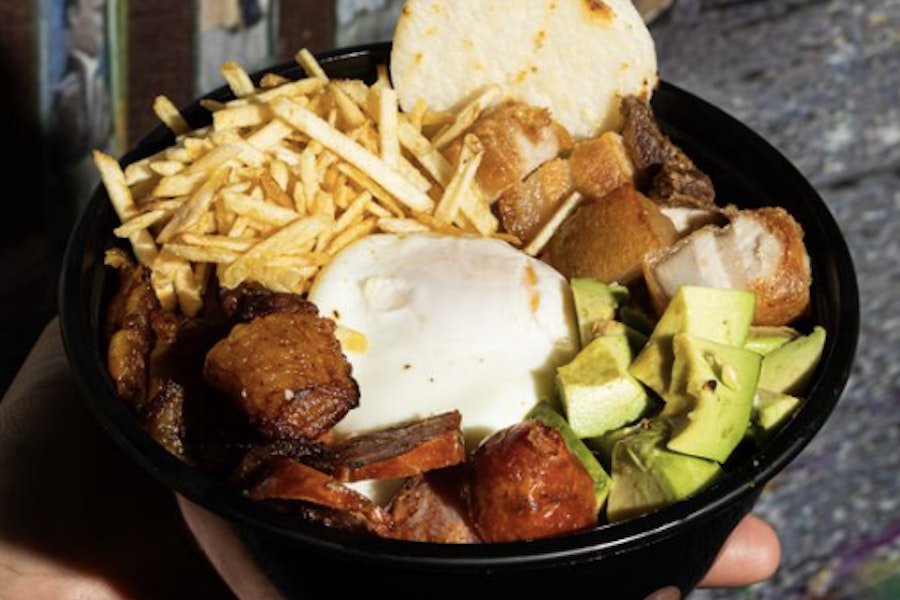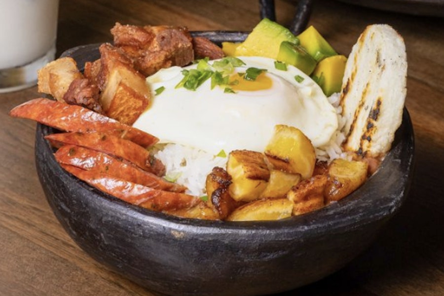 Slow cooked red beans colombian style, topped with sweet plantains, avocado, white rice and arepa. Contains egg