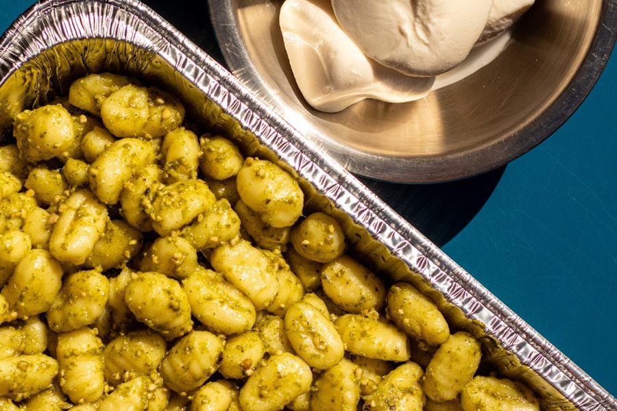 Gnocchi in a rich and savory tomato sauce, comes with a fresh and creamy ball of burrata for each serving