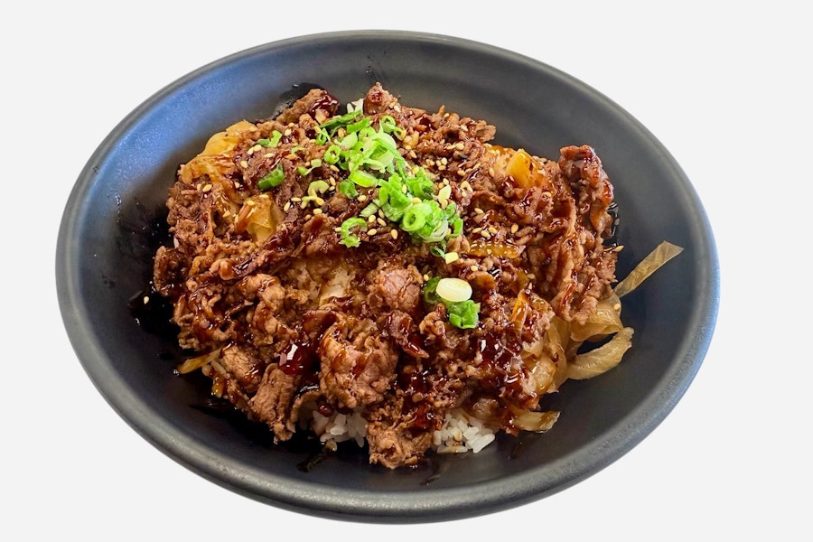 Thin sliced beef and onion simmered in sweet dashi sauce, green onion, & sesame seeds