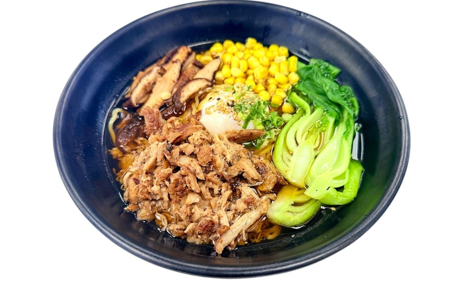 Classic soy sauce broth, shredded duck, poached egg, bok choy, shiitake mushrooms, corn, green onion, sesame seeds and nori