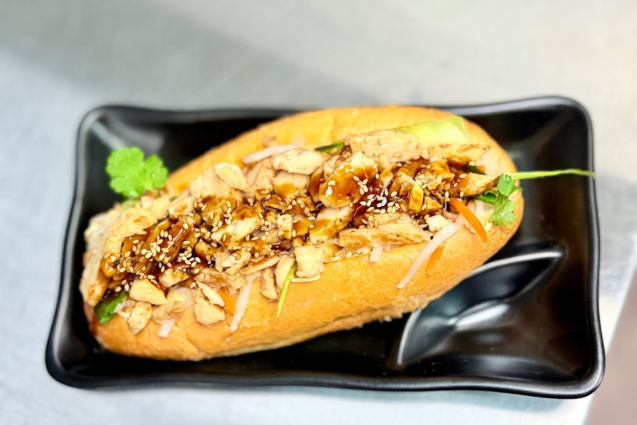 Plant-based beef bulgogi, french bread, pickled radish & carrot, cucumber, jalapeno, cilantro, vegan mayonnaise & vegan hoisin