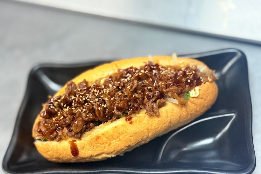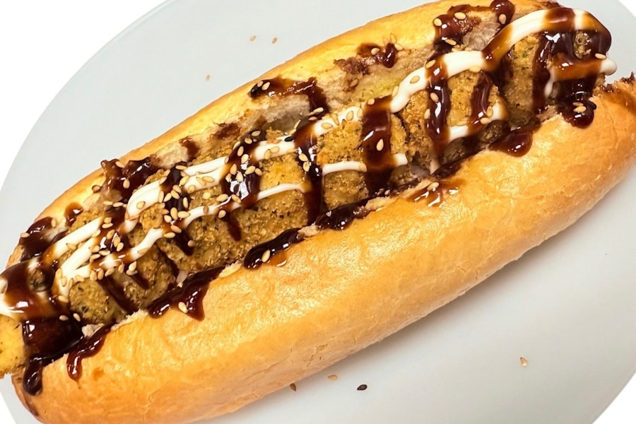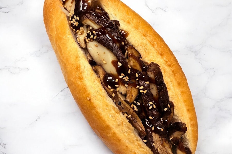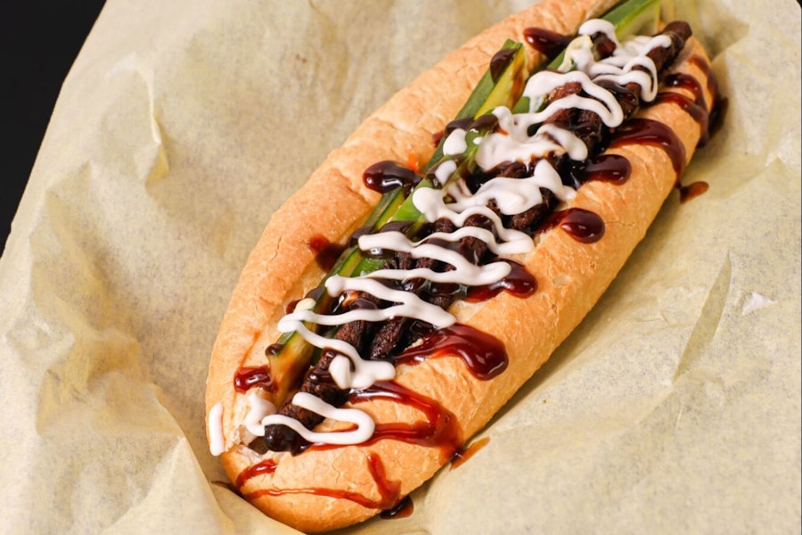 Plant-based beef bulgogi, french bread, pickled radish & carrot, cucumber, jalapeno, cilantro, vegan mayonnaise & vegan hoisin
