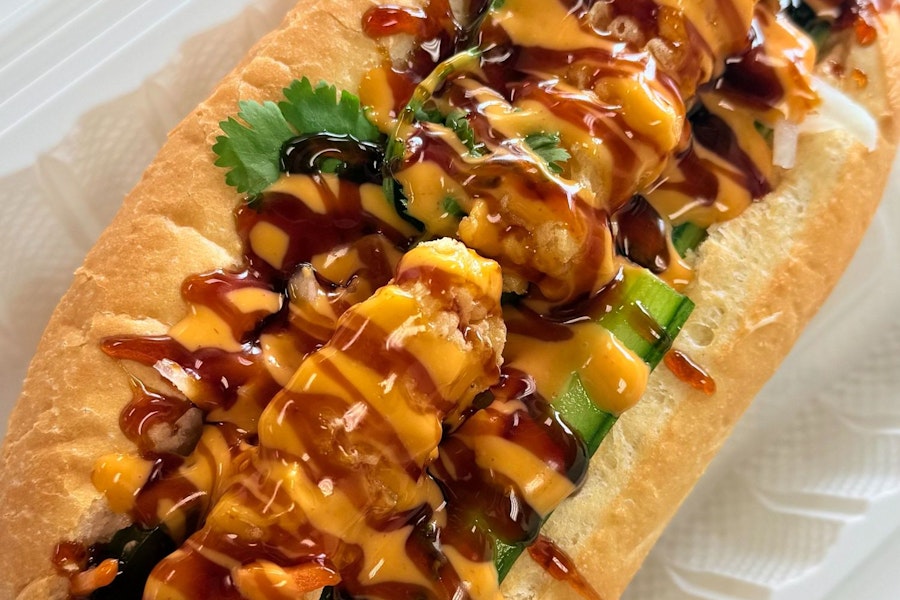 Shrimp tempura, french bread, pickled radish & carrot, cucumber, jalapeno, cilantro, spicy mayonnaise & sweet soy