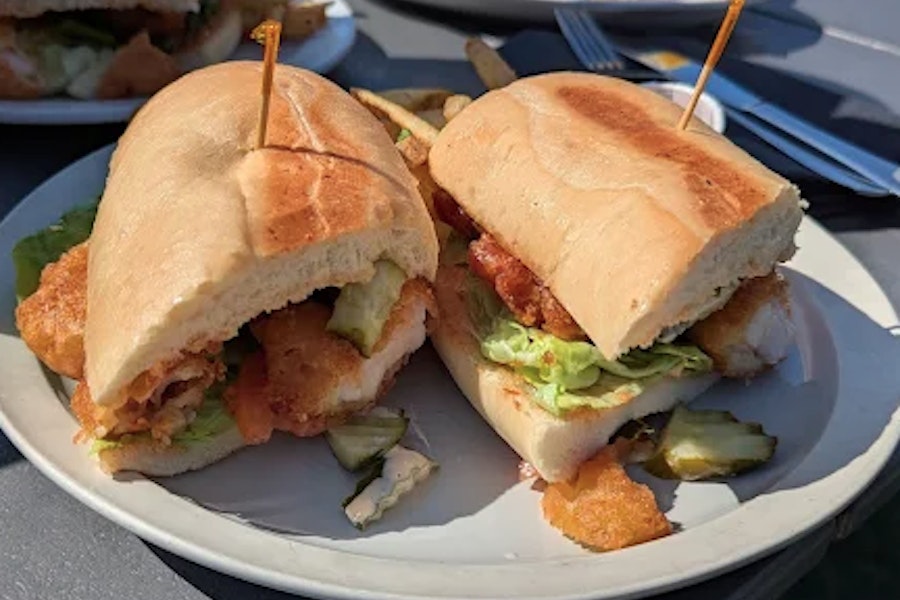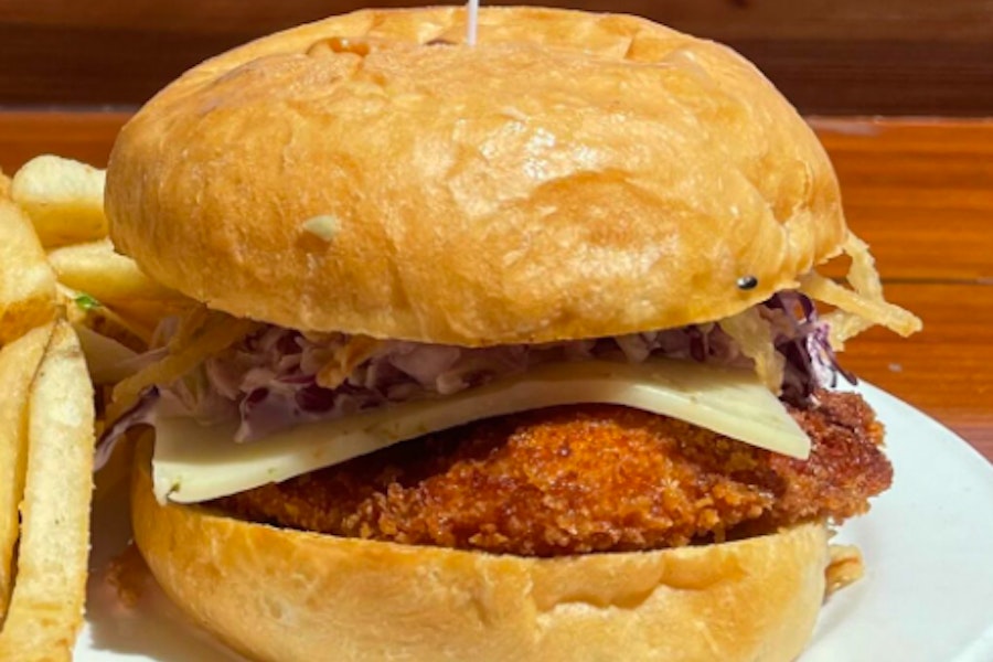 Lemon aioli, chili crunch, butter pickles, brioche bun