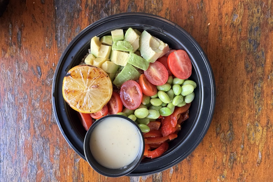 Sesame mix, quinoa, grilled peppers, avocado, grape tomatoes, red cabbage, edamame, vegan lemon aioli