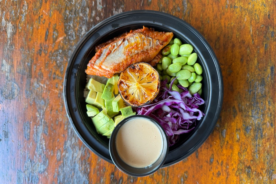 Rice, grilled salmon, edamame, avocado, red cabbage, lemon
