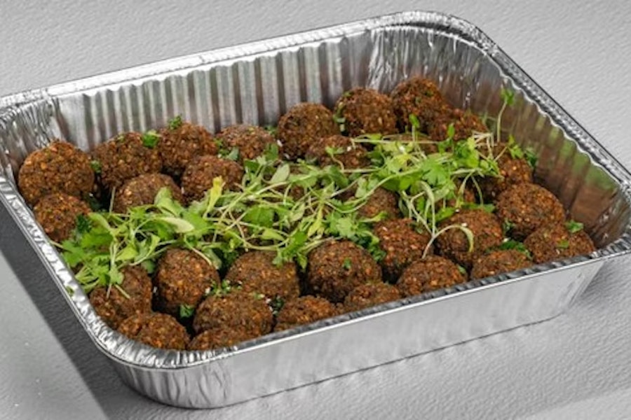 Roasted vegan meatballs. Served with olives, red onion, tomato salsa, garlic confit, tahini, and silan