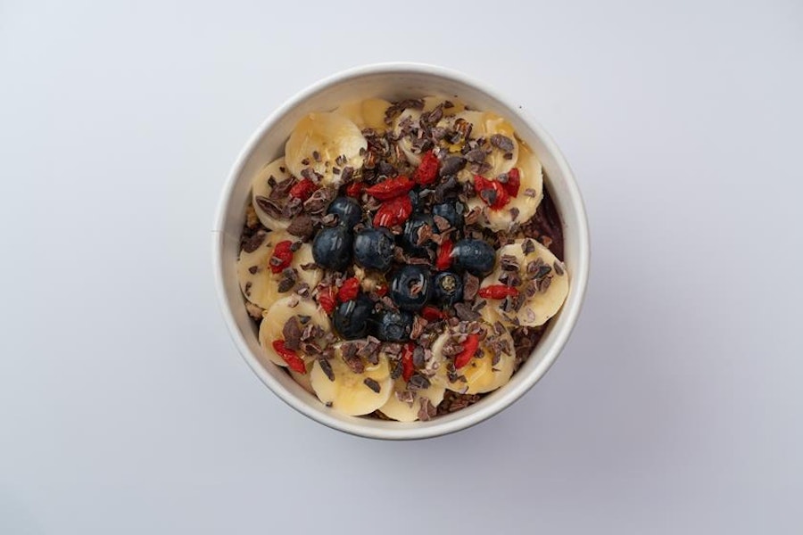 Organic açaí berries & superfood blend (with mangosteen, aronia berry, camu camu, moringa, organic açaí, blueberry & pomegranate) blended with banana and strawberries. Topped with organic gluten-free granola, bananas, strawberries, goji berries - no honey
