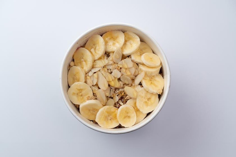 Organic açaí berries blended with peanut butter, banana, strawberries, and superfood blend (with mangosteen, aronia berry, camu camu, moringa, açaí, blueberry & pomegranate). Topped with organic gluten-free granola, banana, almonds, and honey